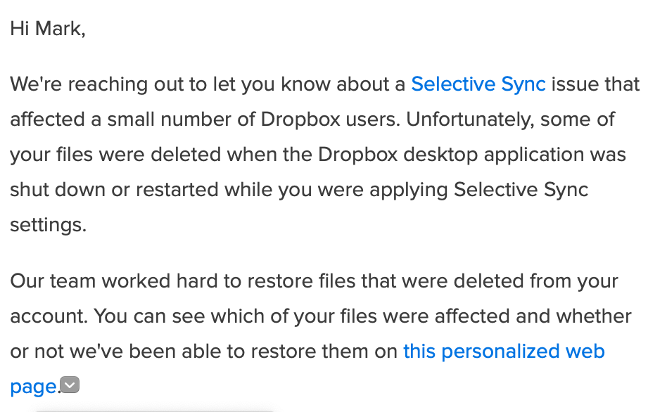 But what happens when you delete the file accidentally? Or it gets corrupted? Now that file is gone from everywhere, or unreadable everywhere. I know most sync solutions have a history feature, but that’s not flawless either. I woke up one morning to this email from Dropbox: